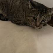 8-9lb male short hair grey tabby. No microchip. Friend but scared. Proof of ownership is required.