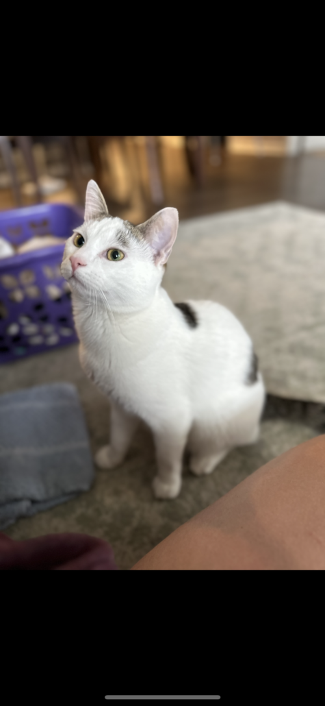 Mostly white non-neutered male cat. About a year old. Has black/gray spots and tail. Will usually come when his name is called. Very friendly. No collar or microchip. Went missing November 17, in Ingalls.