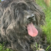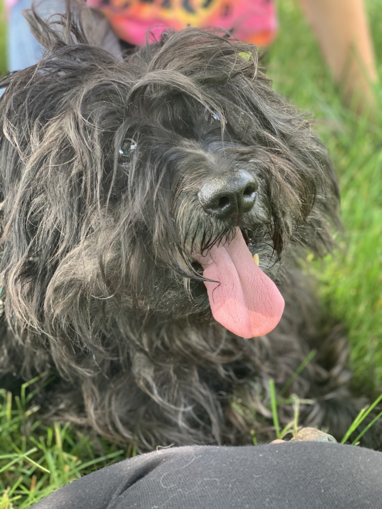 All black mini schnauzer, blue collar. He is almost 16 years old, doesn’t like to be picked up.