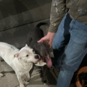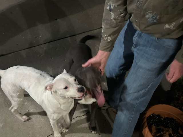 Brown pit Bull with a white female pit bull. White female pit bull was pregnant and has one black spot on back. Brown pit bull seams to be all brown with red collar but no tags.