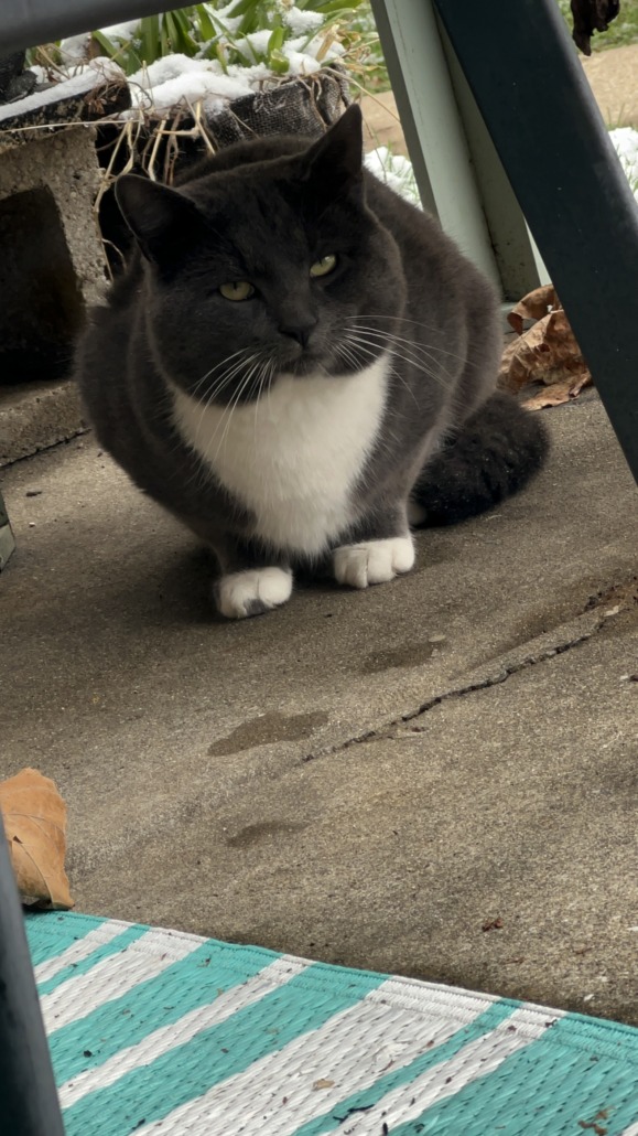 Skittish grey and white tomcat. Appears unaltered. Seems to be an indoor boy.