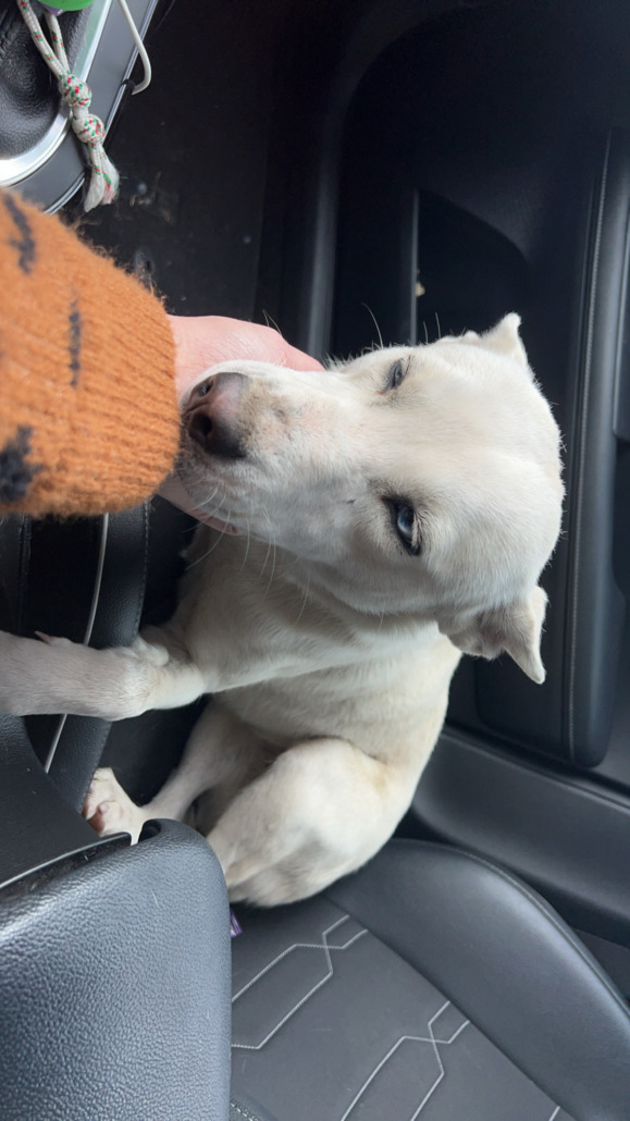 Unspayed female husky/husky mix. primarily white but has a red undertone on her back. no collar.