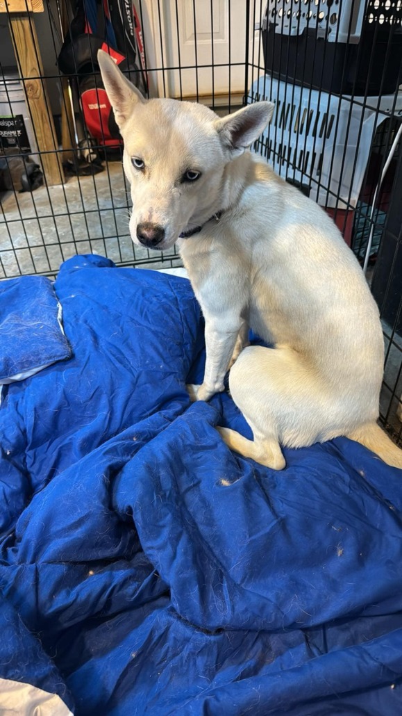 Young female dog age 4 to 7 months, blue eyes. Definitely show signs of having some training. Must show proof of ownership.