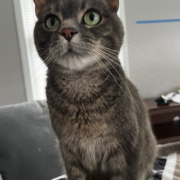 Grey tiger, male, 8 years old, skittish, he is chipped via pet link, not wearing his collar.