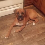 Jade is a brown and white boxer dog with a pink collar with smurfette on it