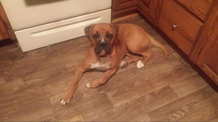 Jade is a brown and white boxer dog with a pink collar with smurfette on it