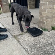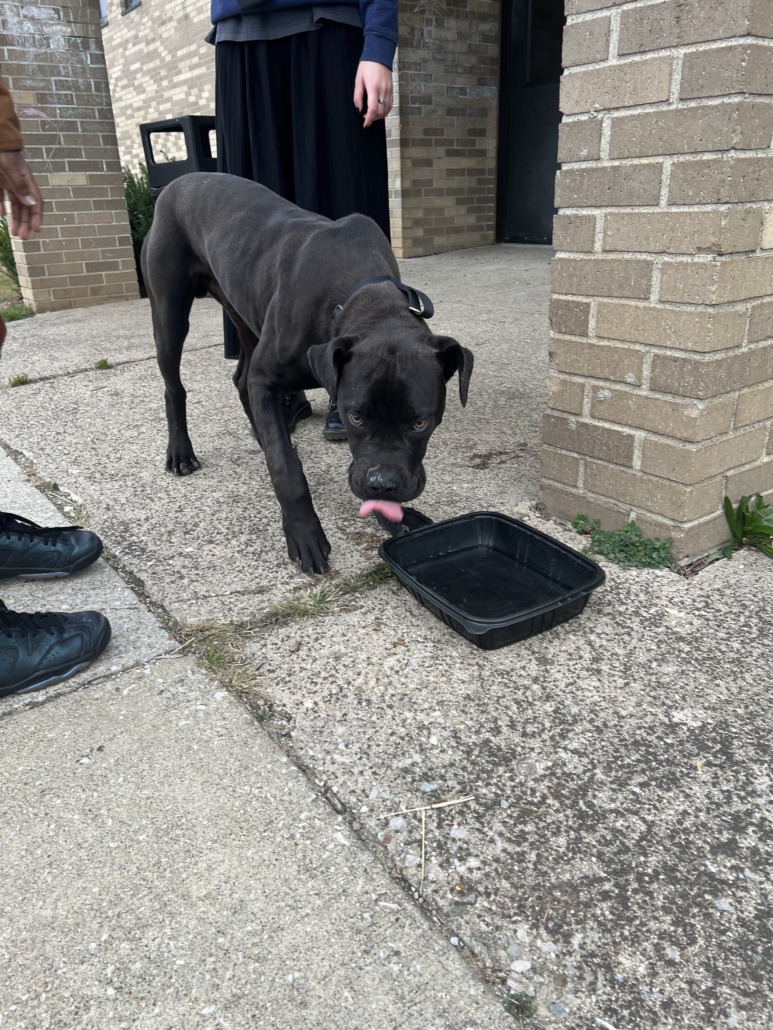 Unaltered black male dog with a cropped tail found on the Butler Lab 60 playground. Very sweet. His disposition and large paws make him seem like a puppy.