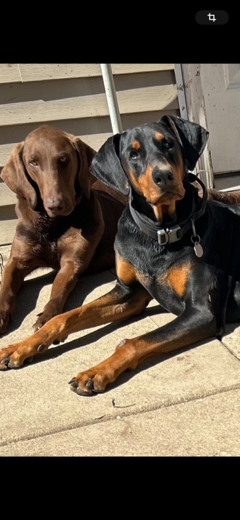 Brown chocolate lab mix escaped by jumping fence sweet girl spayed and chipped. Is possibly with a female Doberman.