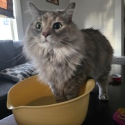 Miga is a fluffy and extremely sociable dilute tortie with green eyes. About 2 years old.