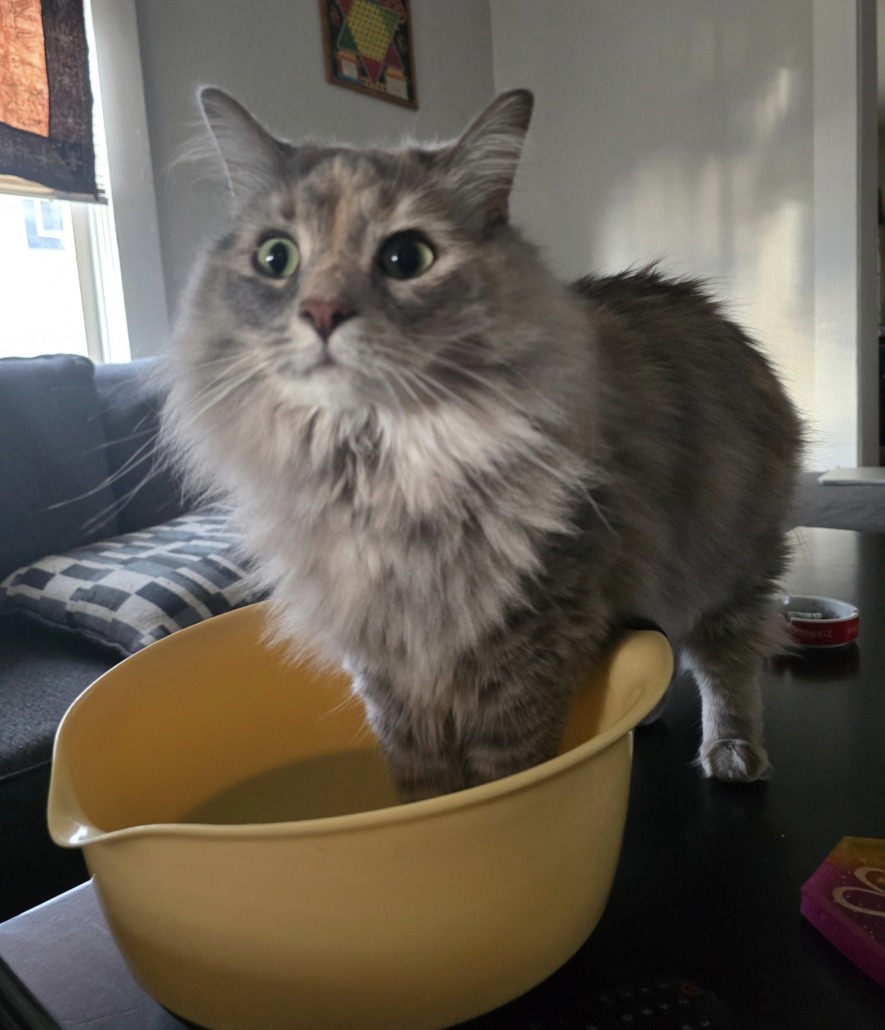 Miga is a fluffy and extremely sociable dilute tortie with green eyes. About 2 years old.