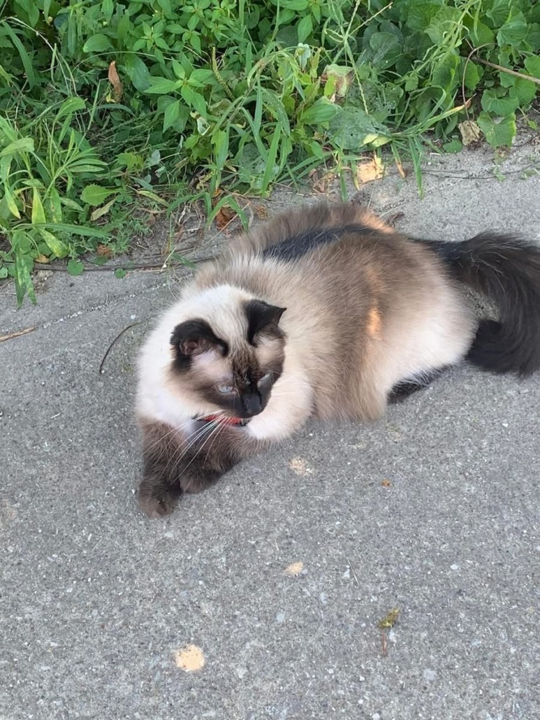 He is a siamese mix, he has a stripe of hair down his back that grows in short compared to the rest of his fur. He has bright blue eyes, and a long brown bushy tail. He is 4 years old and neutered. if you see him and just shake a bag with something in it like treats he will come straight to you.