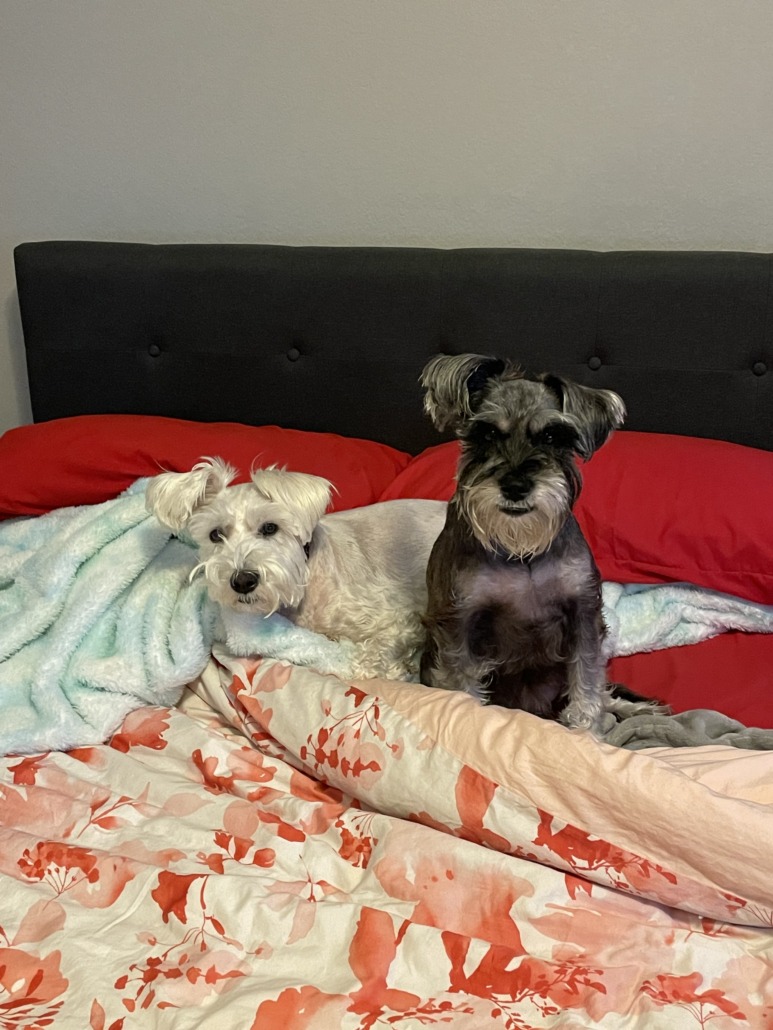 Salt and pepper miniature schnauzer. She has an underbite and a purple collar. Around 20lbs. She is chipped but the chip is set up to my mom’s number.