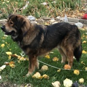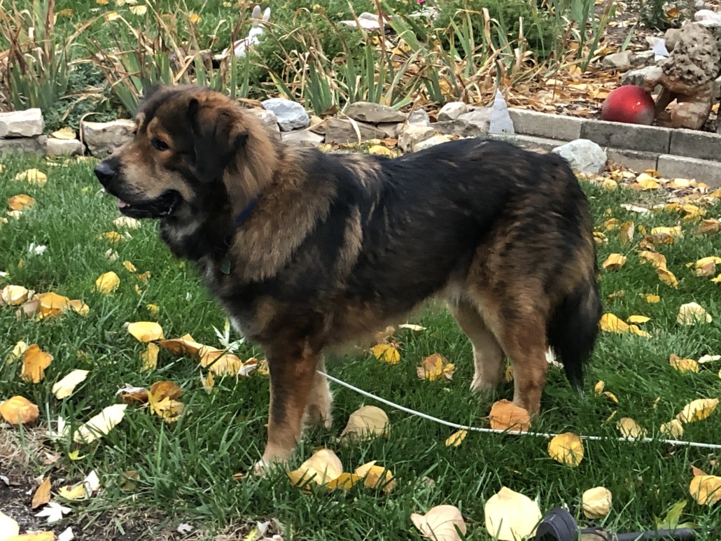Large black brown long hair, Big fluffy tail, tan legs, wearing blue collar with his name and my phone number on it. He is friendly yet very shy!!