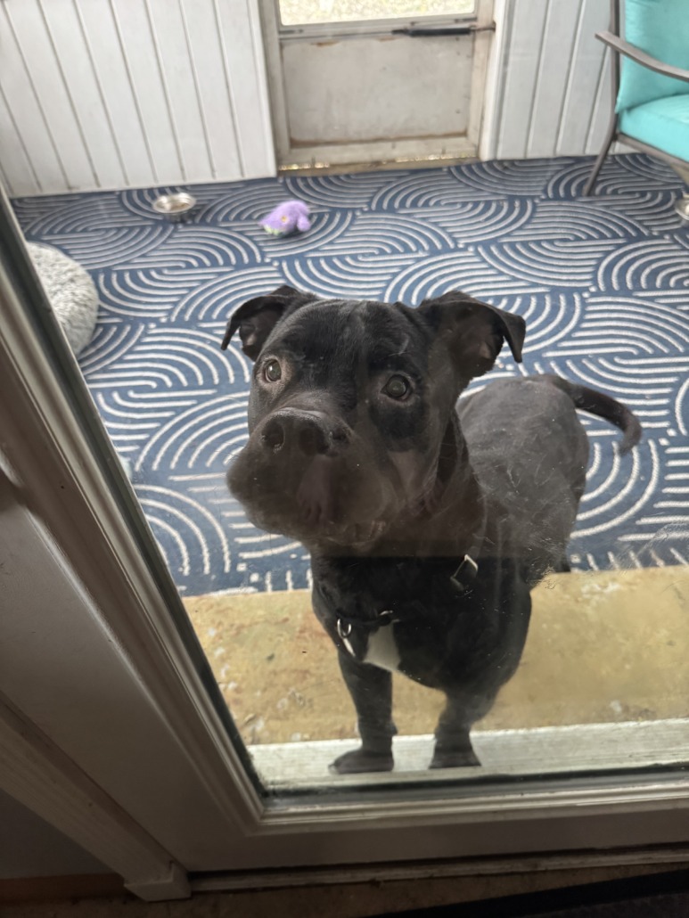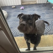 Black Mastiff or Cane Corso possible mix. White spot on chest. Puppy around 9-12 mos. Must show proof of ownership.
