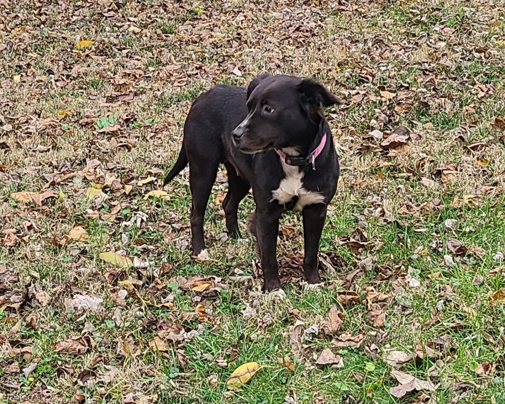 Dog is black with white on front chest and front paws. Sweet dog. Looked like she had puppies. Wearing red collar. I cannot contain. I live in senior living community. Posted on Nextdoor. Will post on Pawboost too.