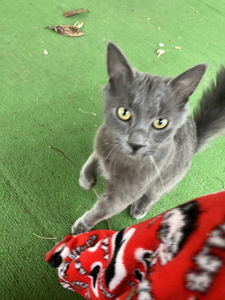 Grey cat with fluffy tail. Looks to be in a skinny/normal weight. Has been crying for food and water. Has been coming back to our porch. Have been taken care of but not allowed to come inside.