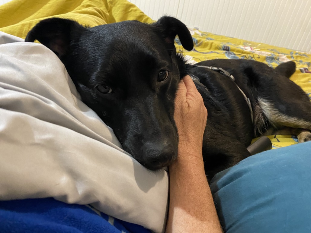 40 lbs, black with brown paws, wearing gray harness and a blue collar that has an AirTag in it.