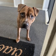 Possibly some sort of pit mix, young, has not been neutered yet. Has a faded black color with no tag.