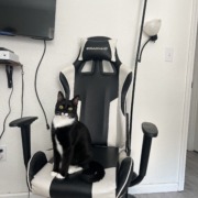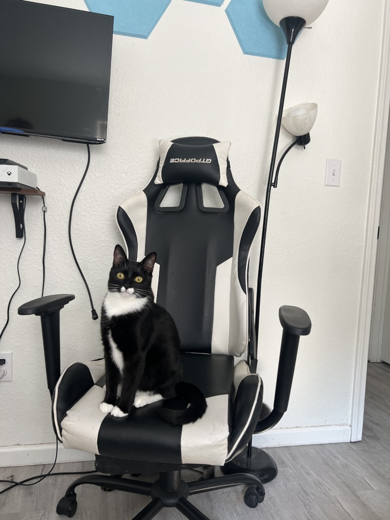 1 year old female fixed tuxie. She goes by Guin and is an indoor cat. She is extremely vocal, but may be shy.