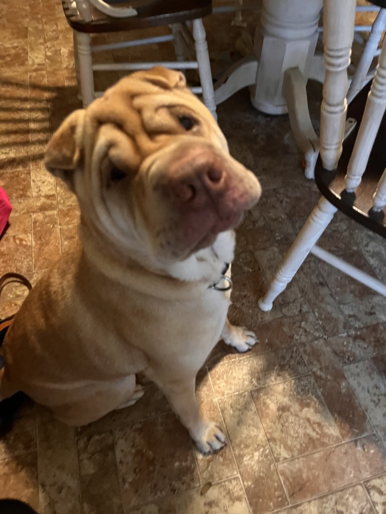 Blonde Sharpei with lighter colored chest , 55 lbs, he was last seen wearing a black and green collar.