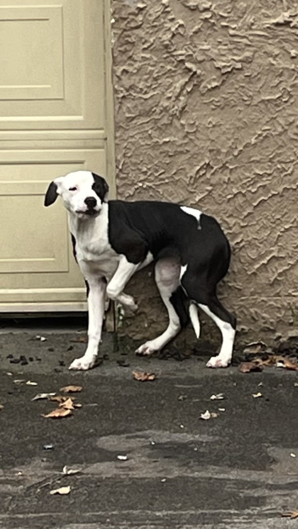 Young black and white dog—looks like a pit mix, maybe about 4-8 months old if I had to guess. No collar.