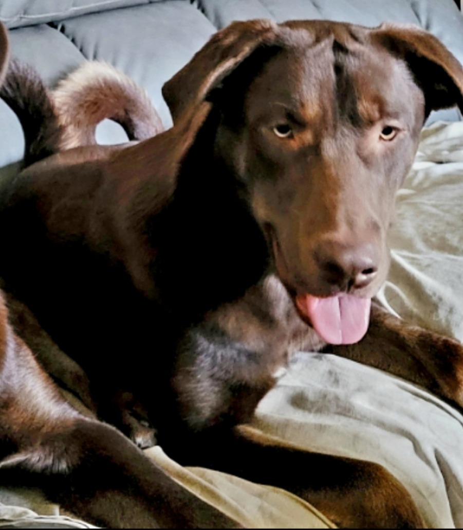 Chocolate Labrador retriever, Siberian Husky mix Huskadore. has one blue eye one brown eye. White rear paws,