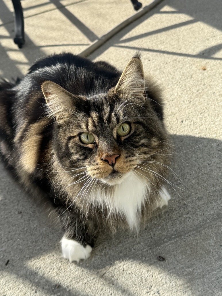 Semi-large grey cat, appears to be pretty sweet but also a little skittish. Has showed up at our house for a couple of weeks now. Seems too friendly to be stray.