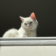 All white, very skittish cat. May come up for food. Afraid of loud noises.
