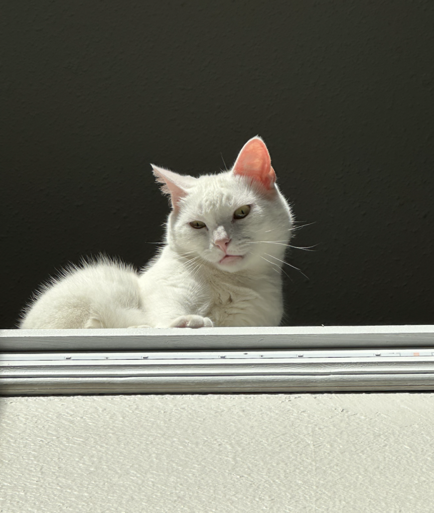All white, very skittish cat. May come up for food. Afraid of loud noises.