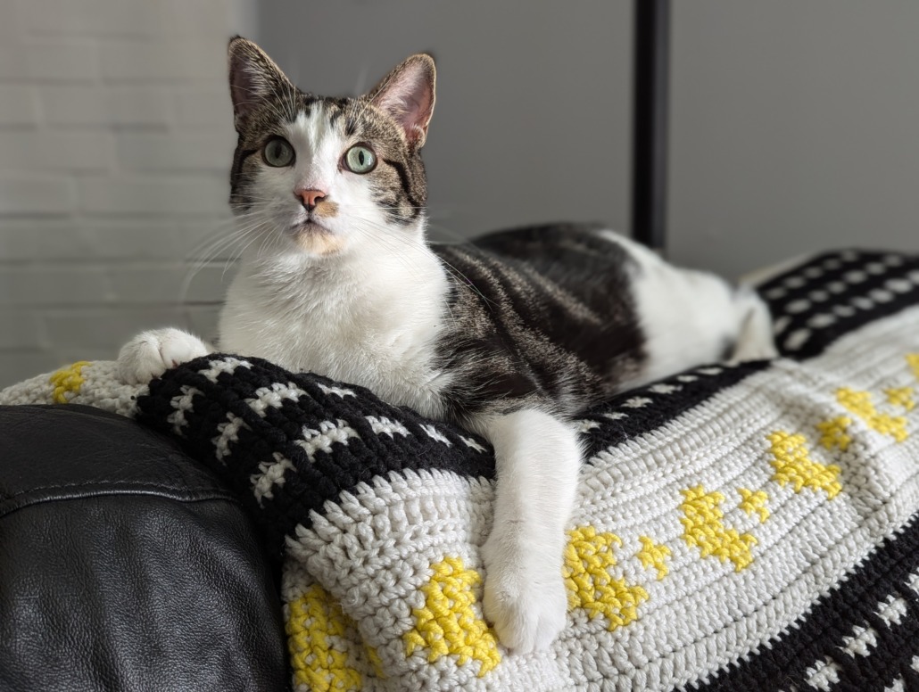 Tabby and white, 12.5lbs, just under 3 yrs old, has a light brown spot on one side of his nose. Very friendly, but is wearing no collar.