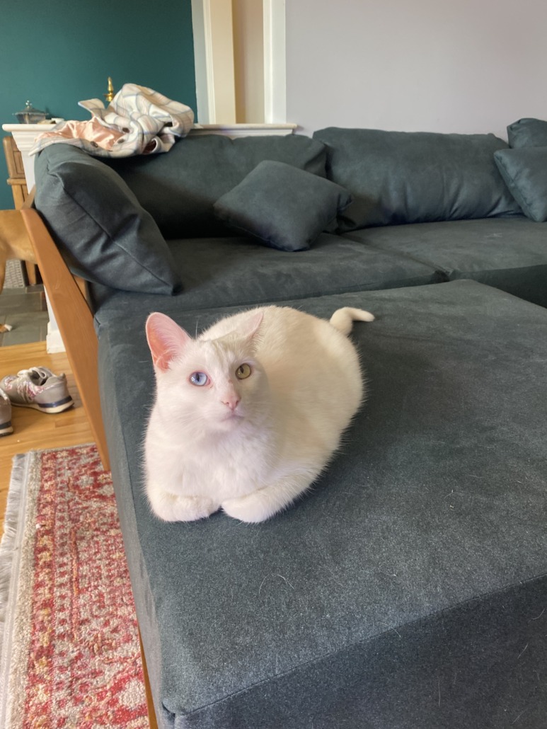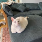 All white with one blue eyes and one green eye. Usually very friendly and chatty.