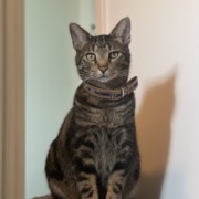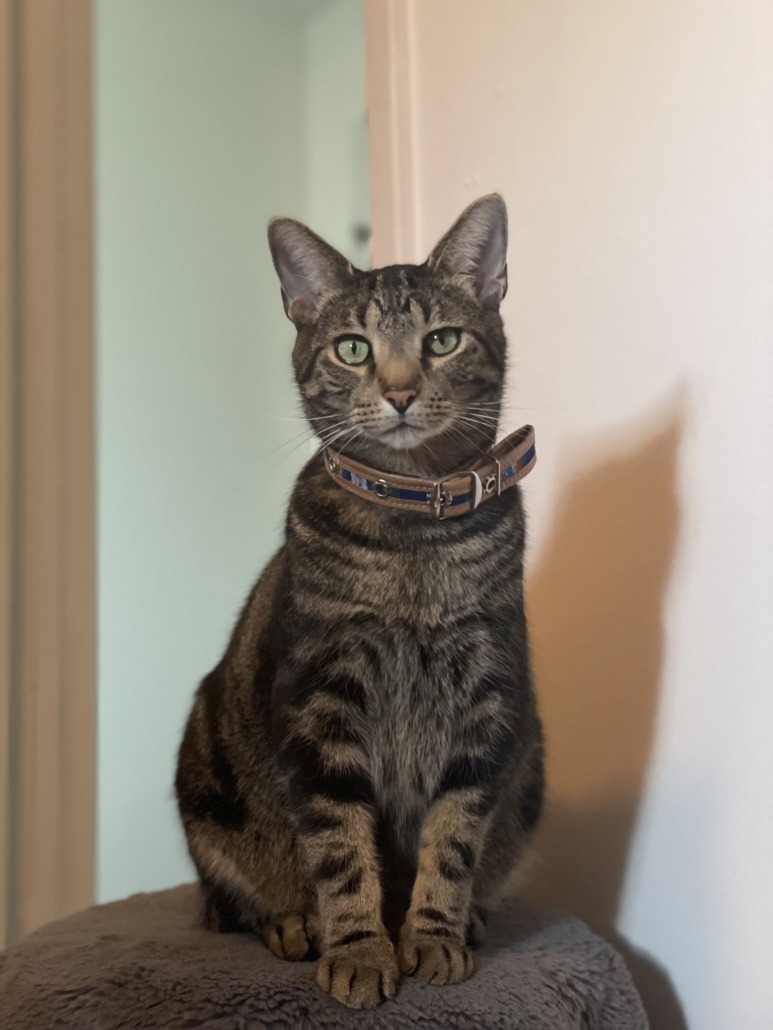 14 year old tabby, super gentle and a little feisty if scared, has a threaded blueish woven brown leather collar on. Birth mark inside on the roof of his mouth looks two splotches. Will if you have treats and shake them.