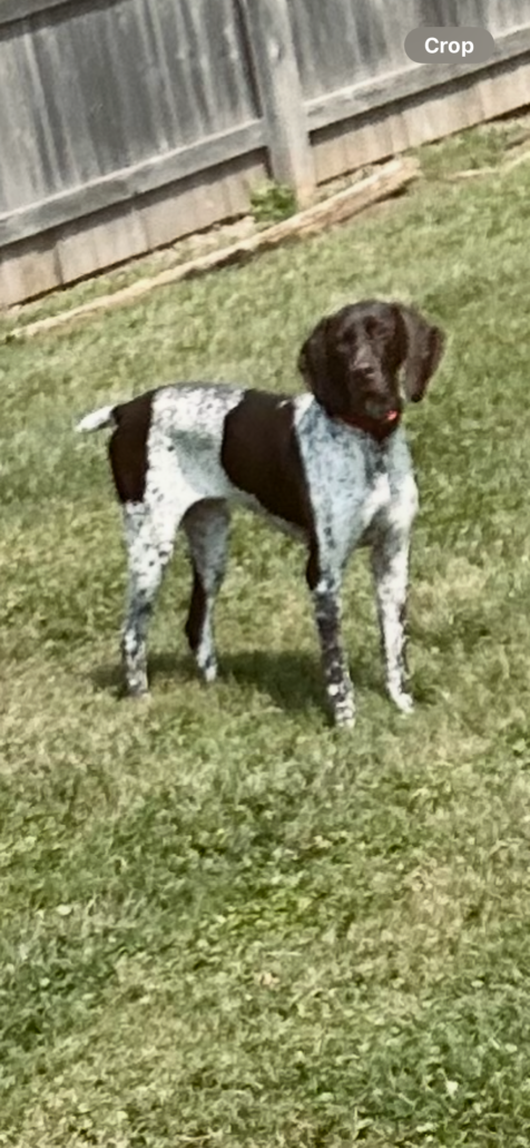 Liver and white spotted German short haired pointer. Wearing light blue collar with Apple tag.