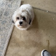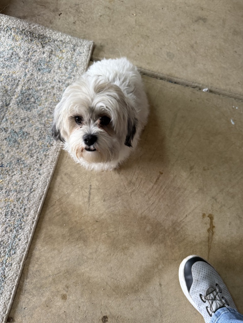 Small dog. Maltese maybe? Shaggy hair. Very nice and comfortable in the home and other pets.