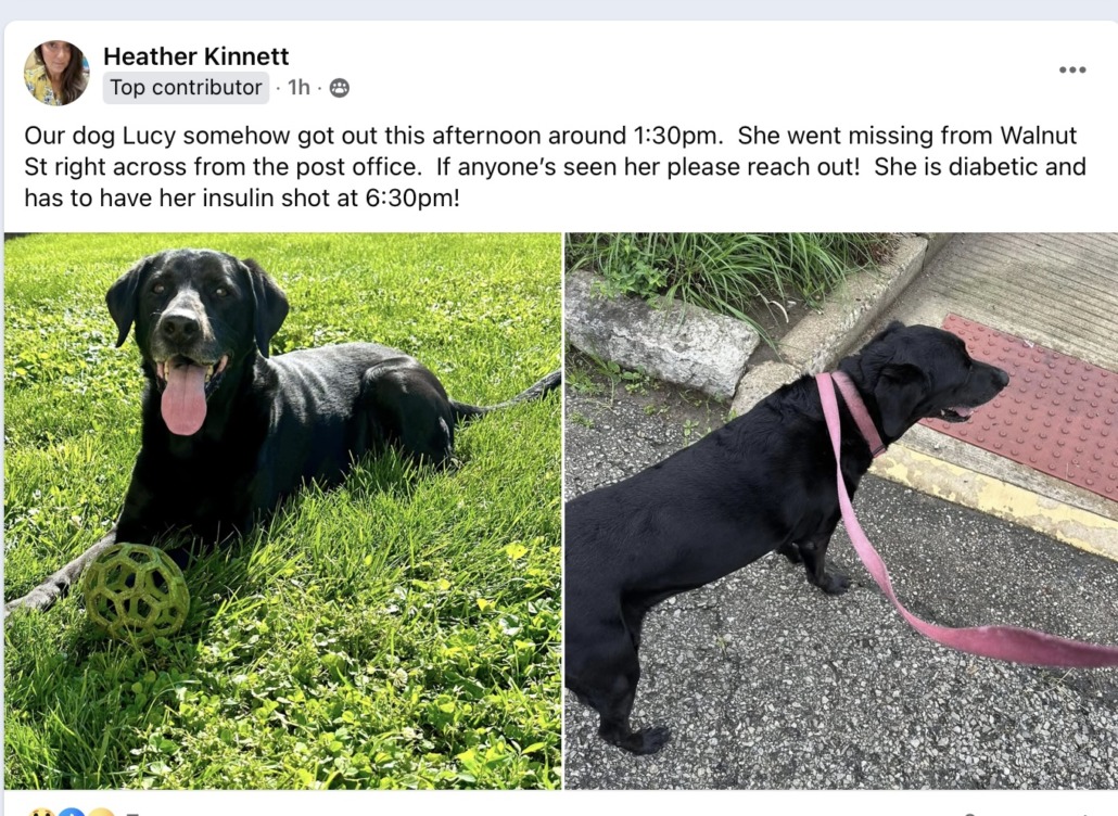 Lucy is a black lab who is very friendly and she is diabetic so she may be lethargic when found because she needs insulin.