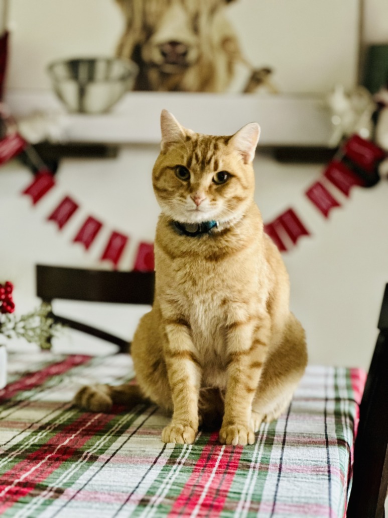 Peabody is an orange striped cat. He has on a blue collar with an air tag and a gray flea collar. He has orange freckles on his nose. He also has a condition called FHS, which makes his back and tail twitch, which sometimes makes him cranky. He loves to be outside and explore during the day, but he’s usually home at night for treats and warm blankets.