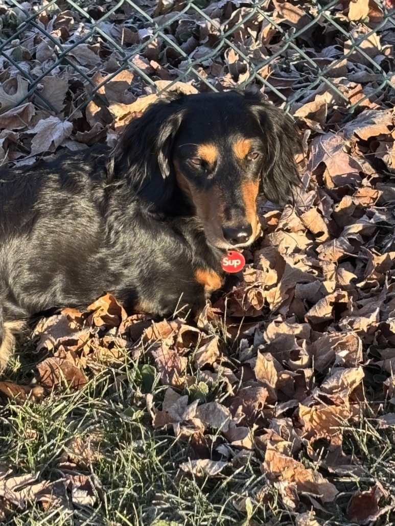 3 year old neutered male dachshund named Beau. Black, long hair with tan markings. Wearing a collar with a tag.