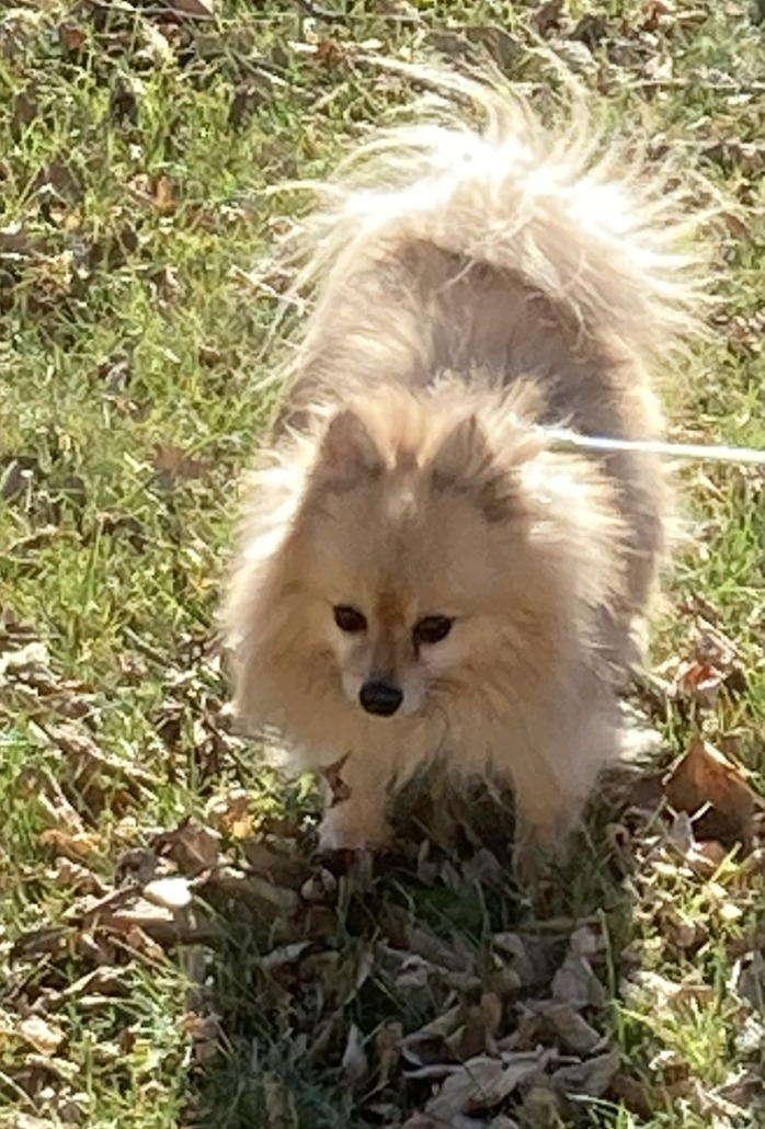 Pomeranian male. Missing a lot of teeth. One tooth sticks outside of his mouth to the side. He is loosing his hearing and sense of smell.