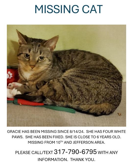 Lost Cat, Alert #81486 Gracie missing near 10th street and Jefferson Ave, Indianapolis46201