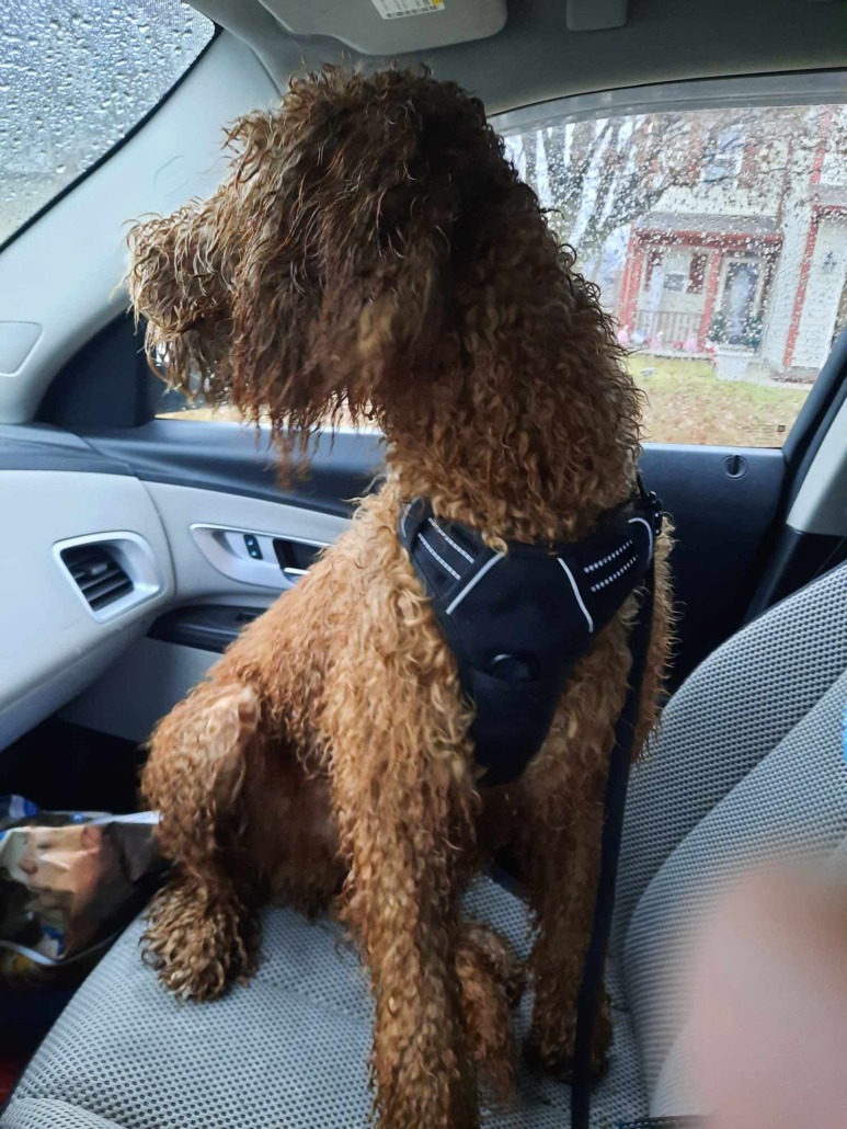 Found male Goldendoodle, no chip, no collar, wearing black harness.
