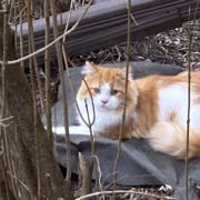 Bushy orange and white kitty. Scared but with patience is letting me pet him/her. Proof of ownership required.