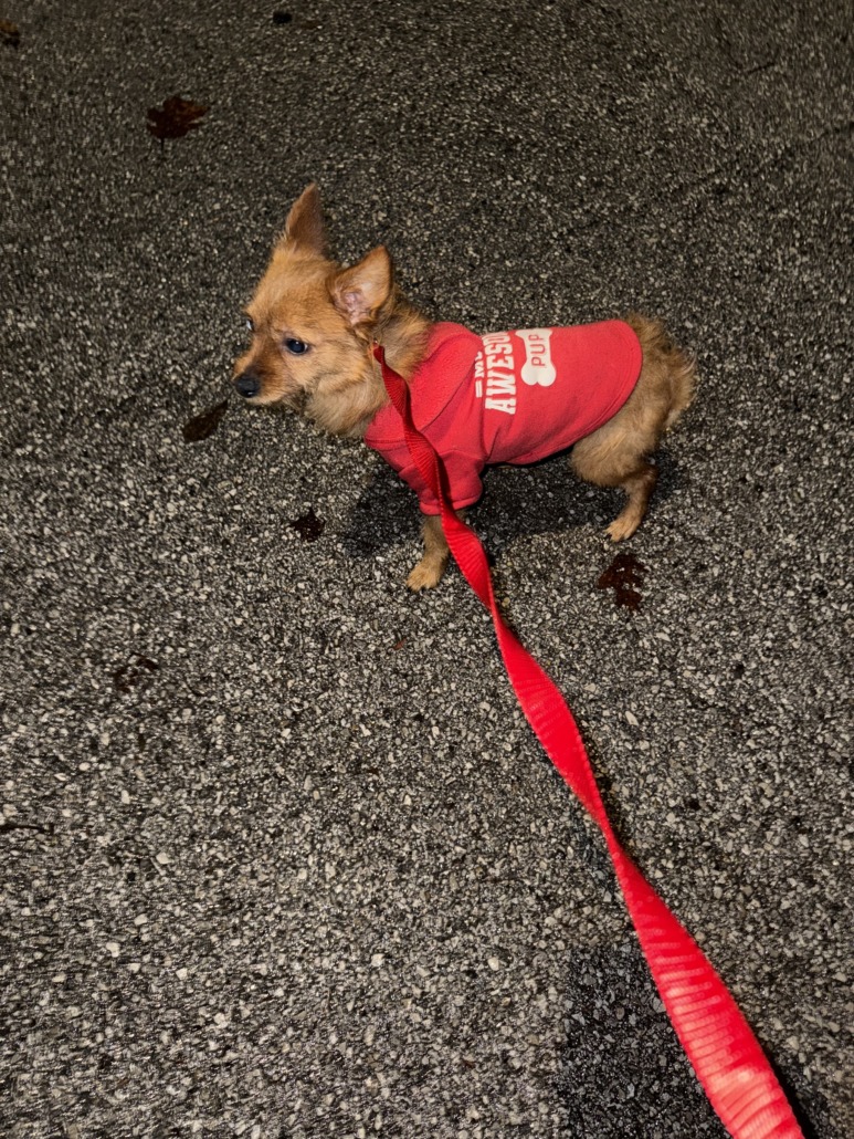 Little brown dog wearing a red shirt that says “mom’s awesome pup”.