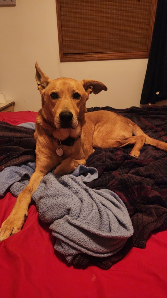 One floppy ear. Not aggressive. Might not come when called. But loves car rides, so drive up near him and call him into your car lol