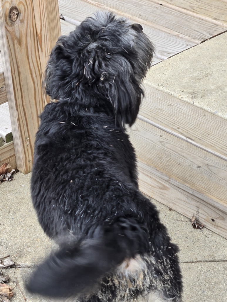Very friendly little fluffy black dog. Also has some while and gray on legs