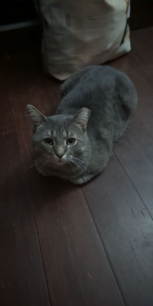 Large grey male cat, neutered and ear tipped. He’s a stray, but typically stays indoors at night with us over the winter months.