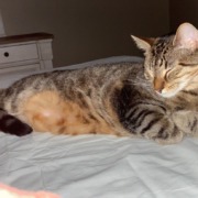 Larger male tabby, neutered, no collar. Mainly brown, tan and black stripes
