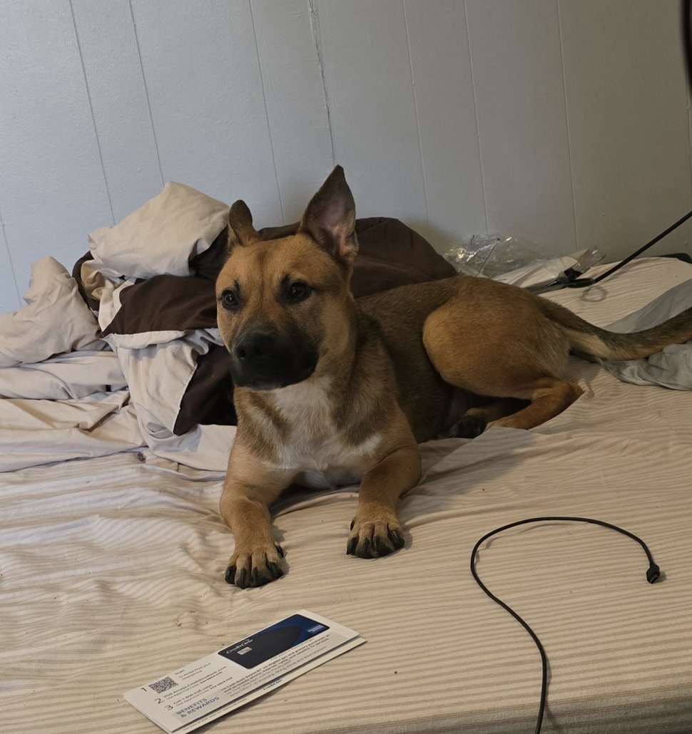 Seems to be a German Shepherd, possibly mixed with a malinois, ribs are peeking through his fur but he doesn’t seem to be too malnourished, definitely was trained at some point.