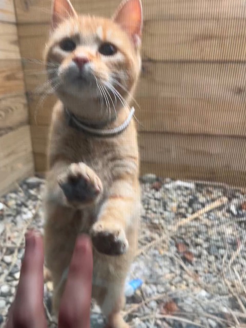 Orange/gold/white cat with a gray and white collar- no ID on the color.