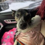 Looks like a little terrier. Possibly older femals. She has a pink coat on and a collar. She is NOT chipped. She is safe and warm currently but will need proof of ownership.
