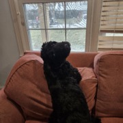 Fly is a black goldendoodle. She is very very sweet but timid. She is roughly 2 years old and is Huey’s sister.